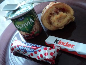 Korai első reggelim.( a kindert a 2. reggelim után nyomtam be). A 2.reggelimnél a kenyér a felvágott és az 1db medvesajt azért van ott,hogy ebből készítettem a pirítóst. Ebédem amúgy sóska(kis tejföllel,lisztel habarva) hozzá meg szezámmagban bundázott csibecomb.