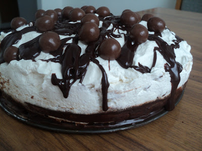 A tetejére a felvert tejszínhabot rusztikusan elkenem,rácsorgatom a felolvasztott csokit…….és ráteszegetem a csokigolyókat.