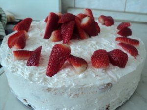 Menta levelem sajna nem volt így csak sima eperrel díszítettem! Nagyon finom könnyű,nem túl édes sütemény!